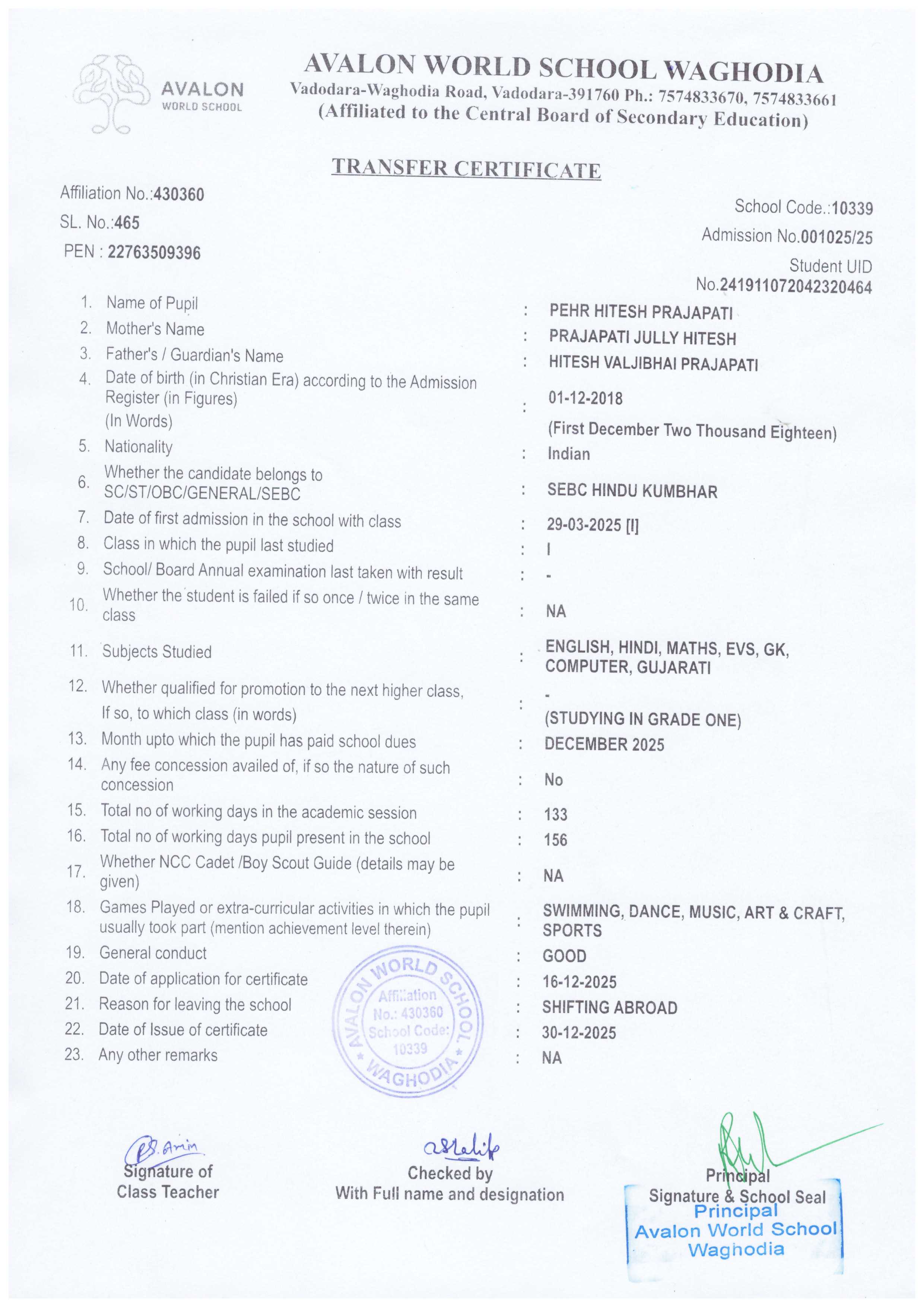 AVALON WORLD SCHOOL WAGHODIA - TC ISSUED
